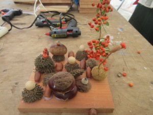 木の実のクラフトは、グルーガンを使って板の上にドングリや