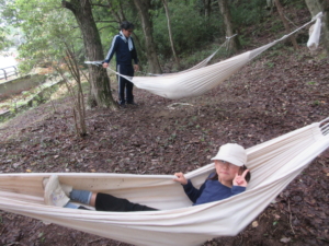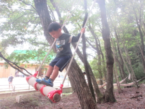 森の中では子どもさん達が山のすべり台、ブランコ、ハンモックで