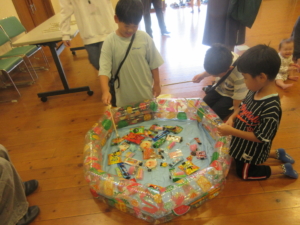 ●バランスボール遊び、「ひとはく」の昆虫標本の展示
