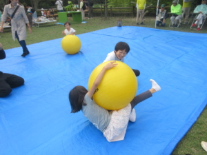 公園管理棟前の広場ではバランスボール遊びや縄跳び、移動博物館