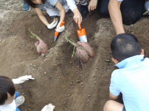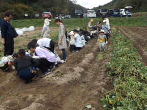 西の谷の畑では、13時からイモ掘りが始まり、大きなイモを