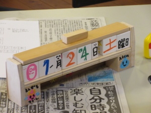 最後に組み立てた木枠の中に数字と曜日を書いた角材が収まるか